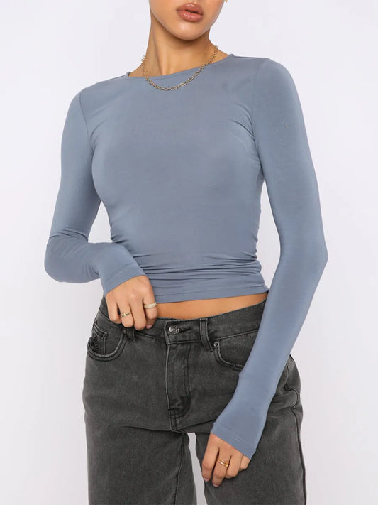 Women's Fall Casual Slim Fit Basic Tops Solid Color Long Sleeve Crew Neck Pullover Y2K Tight Tee Shirts Show Navel T-Shirt