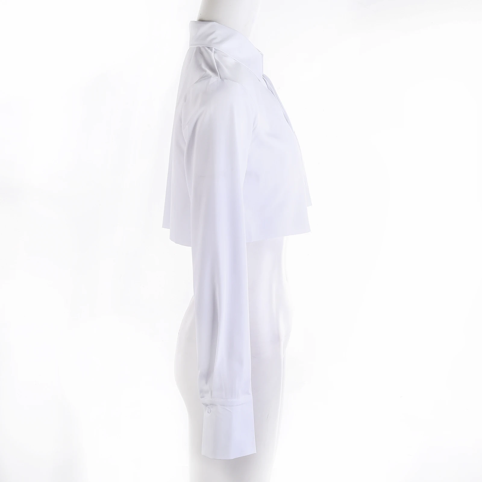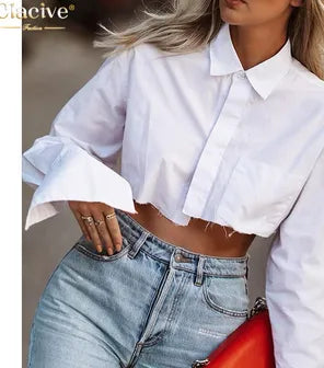 Elevate your spring wardrobe with our Women's Crop Shirt, featuring a turn-down collar, exposed navel, and an irregular solid color design for a trendy and unique style statement. This spring clothing essential effortlessly combines chic fashion with a touch of boldness, ensuring you stand out with confidence.